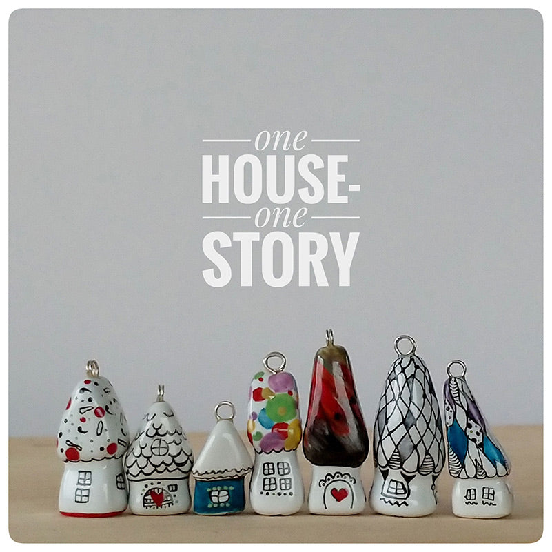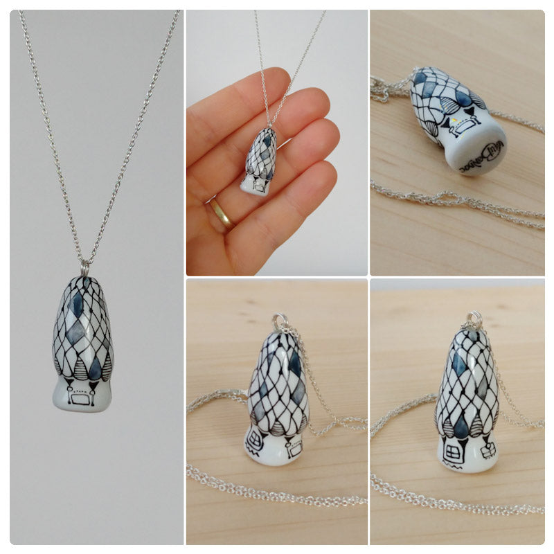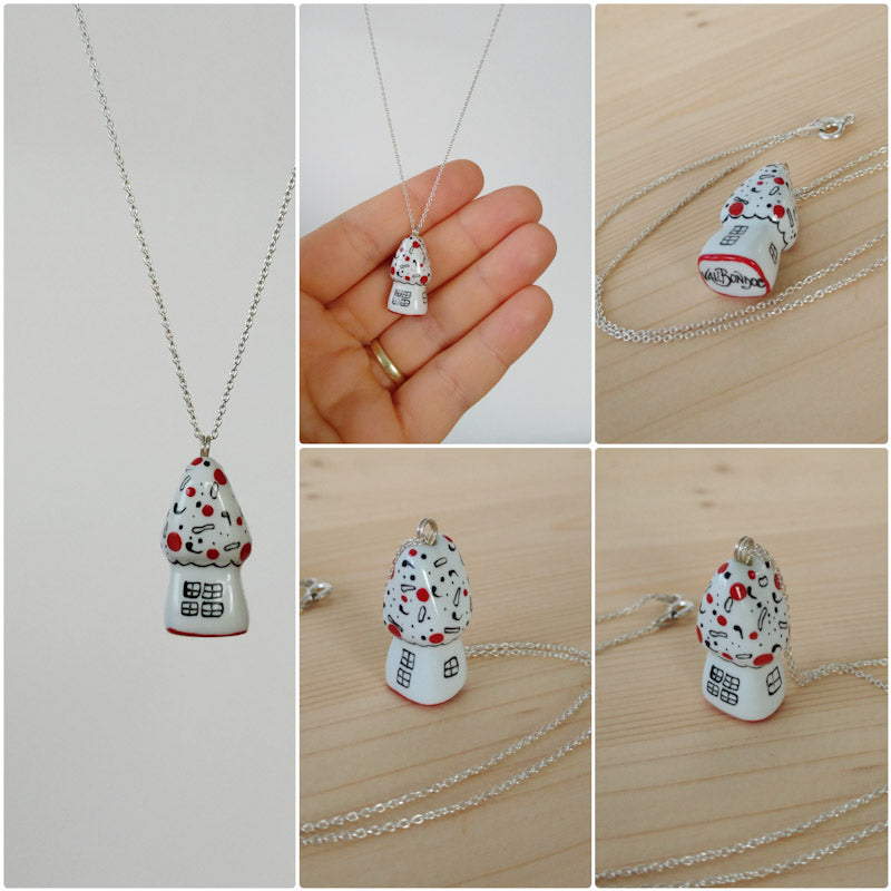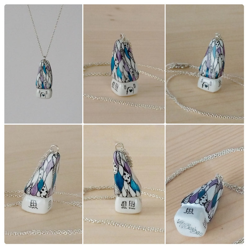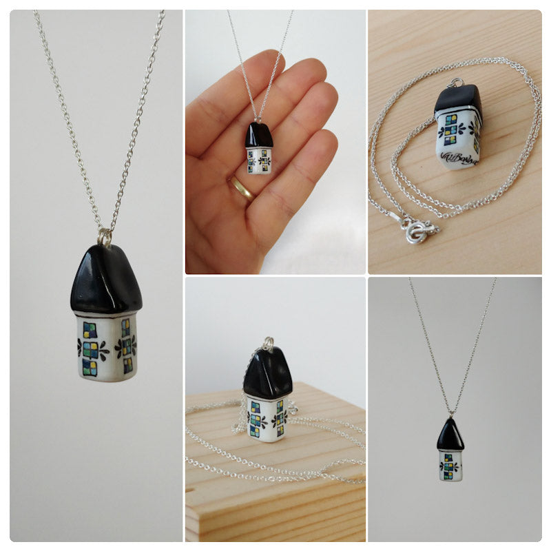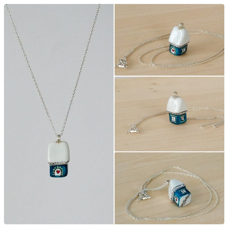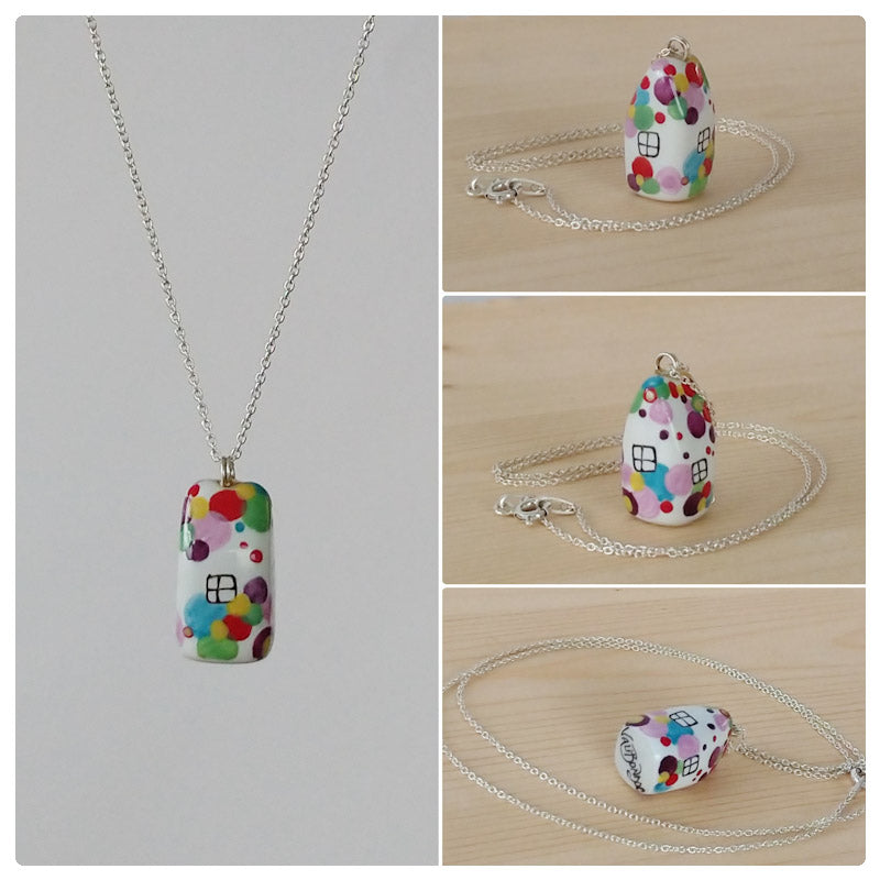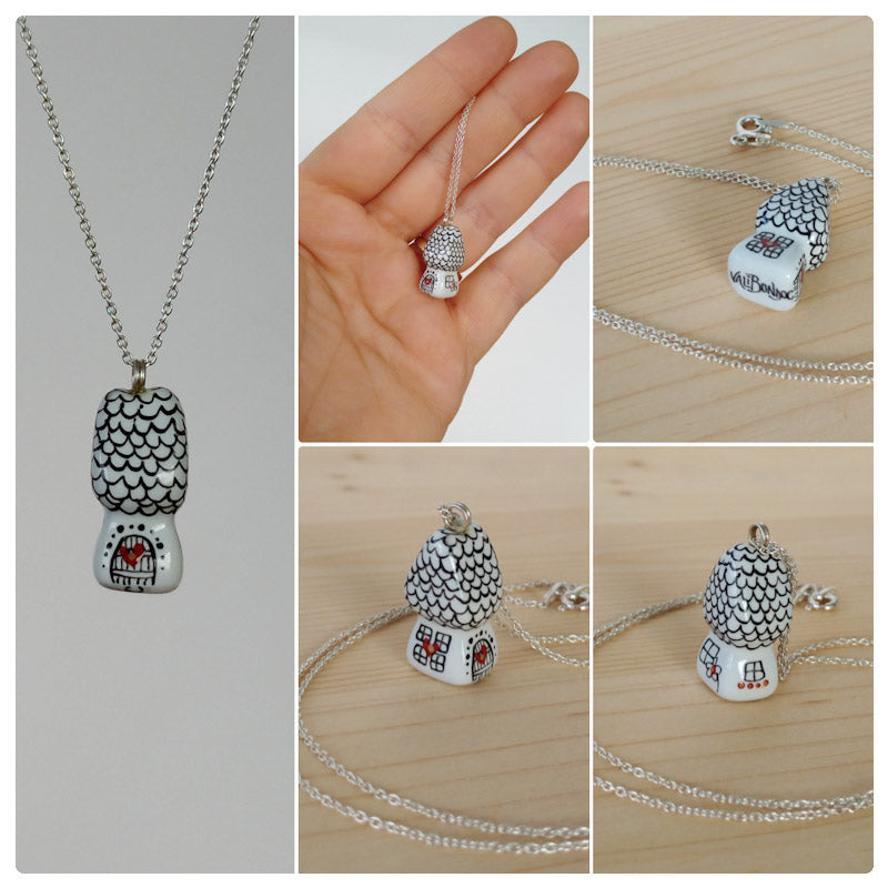 Căsuță pandantiv din porțelan modelată și pictată manual cu multă atenție pe detalii.