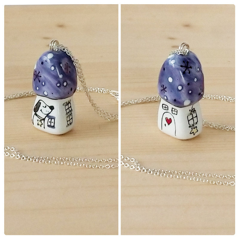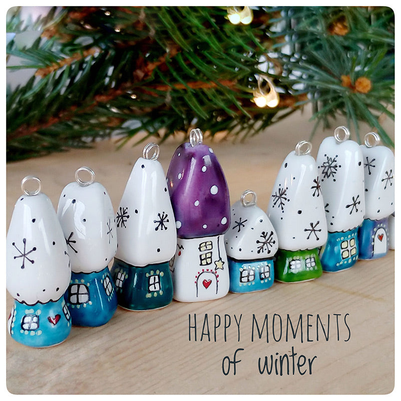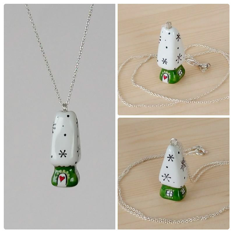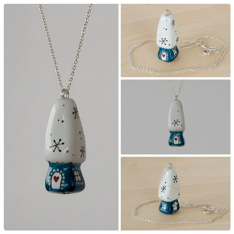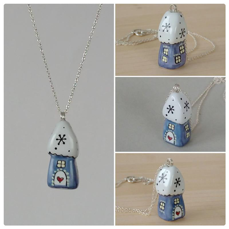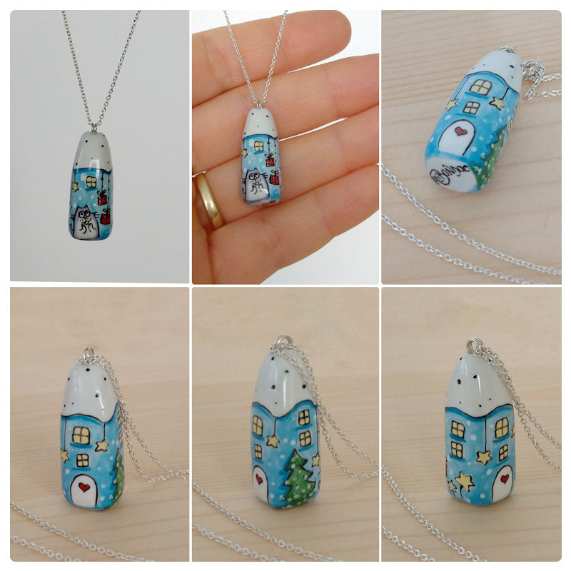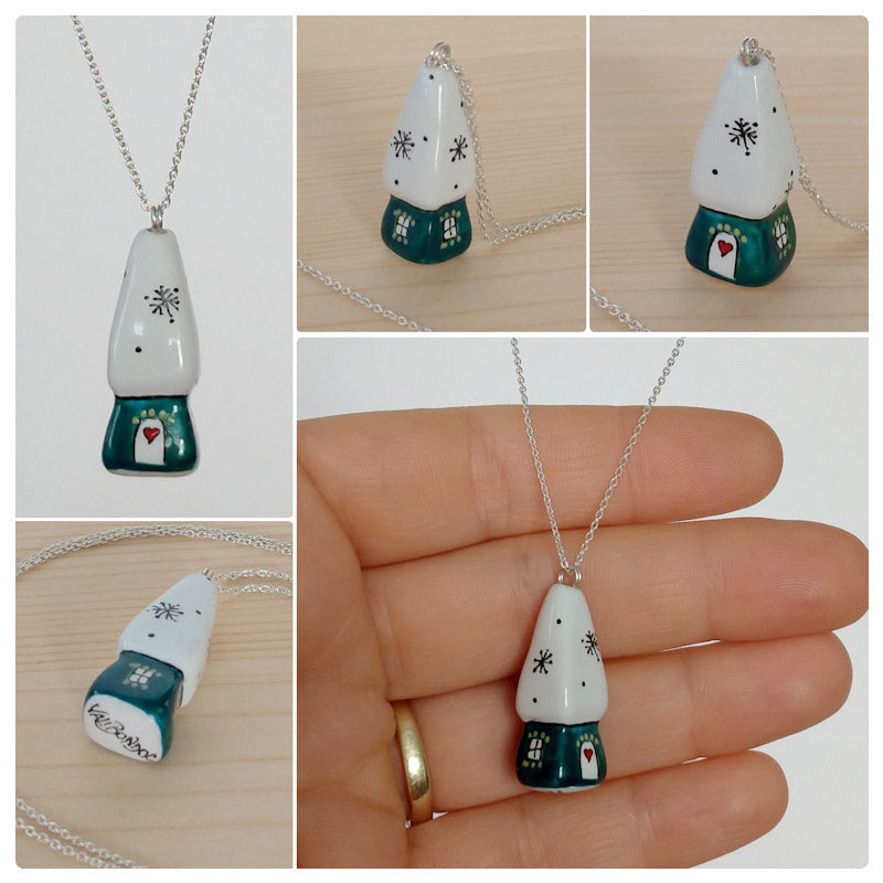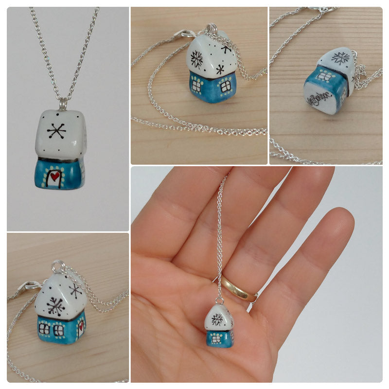 Căsuță pandantiv din porțelan modelată și pictată manual cu multă atenție pe detalii.