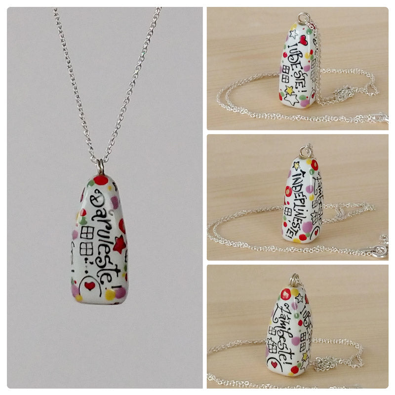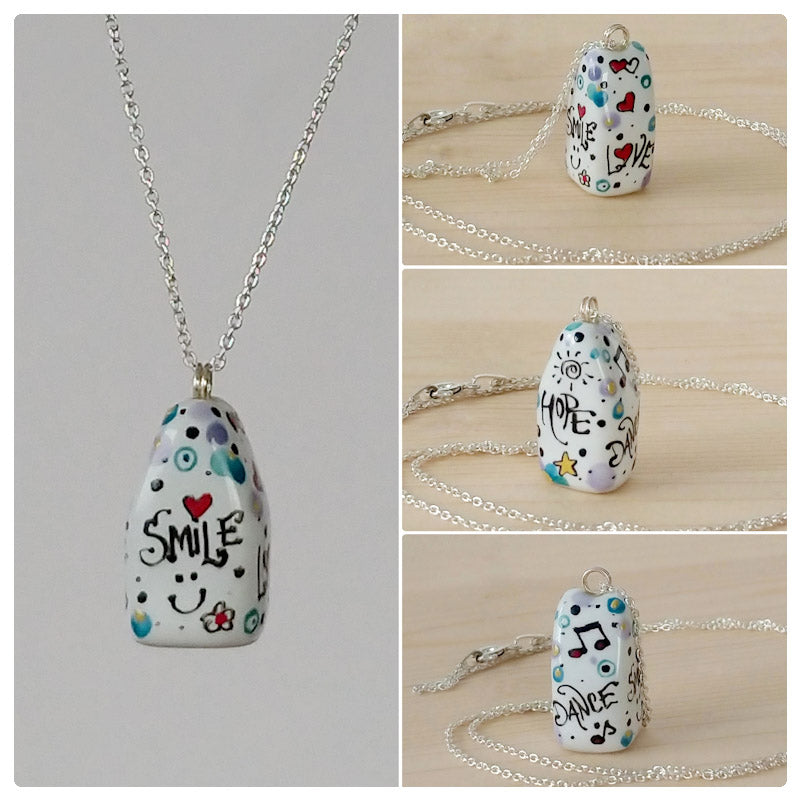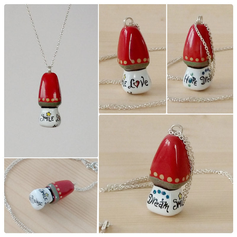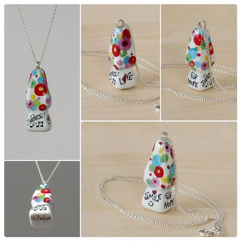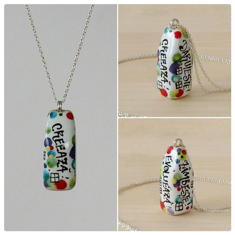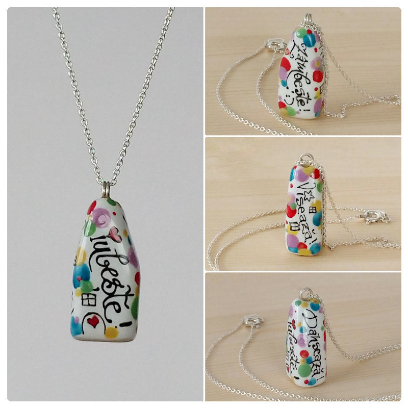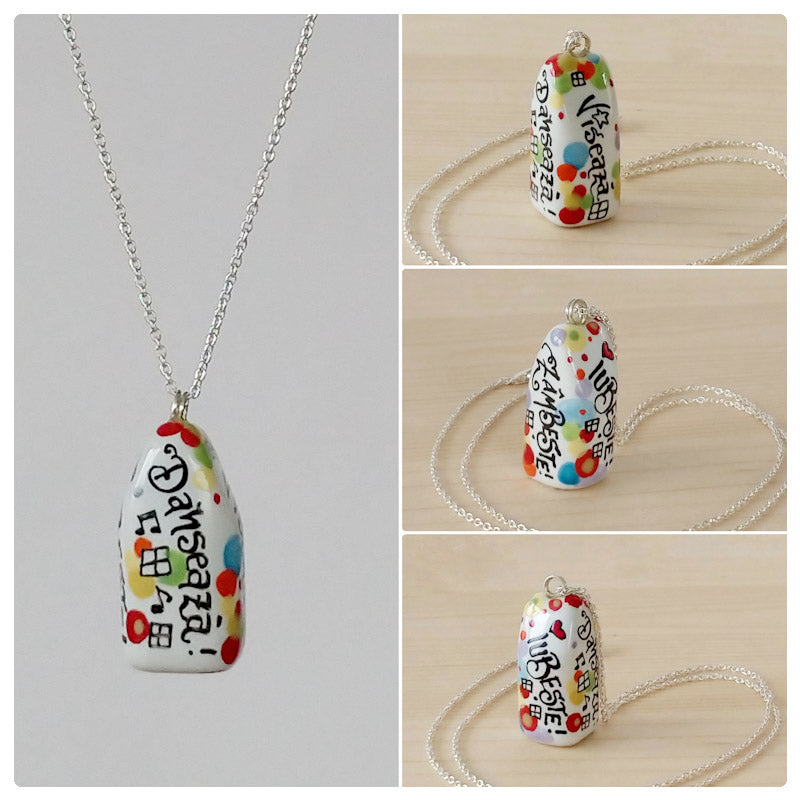 Căsuță pandantiv din porțelan modelată și pictată manual cu multă atenție pe detalii.