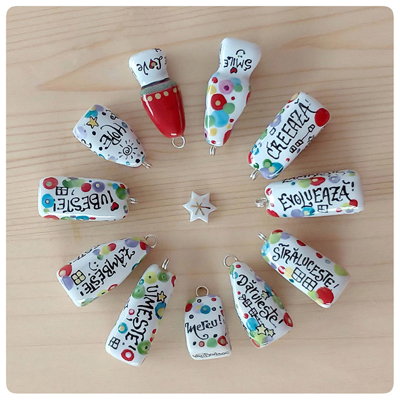 Măsoară aproximativ 1cm x1 cm iar inălțimea variază intre 1.5cm și 2.8cm (in funcție de model), fiecare piesă fiind modelată, glazurată, pictată (folosind culori ceramice de inaltă temperatură) și arsă in cuptor de 3 ori.